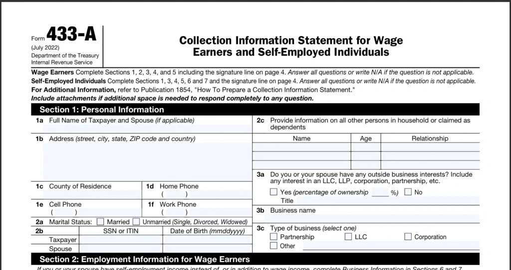 1. Choose the correct IRS form (433-A, 433-B, or 433-F)
